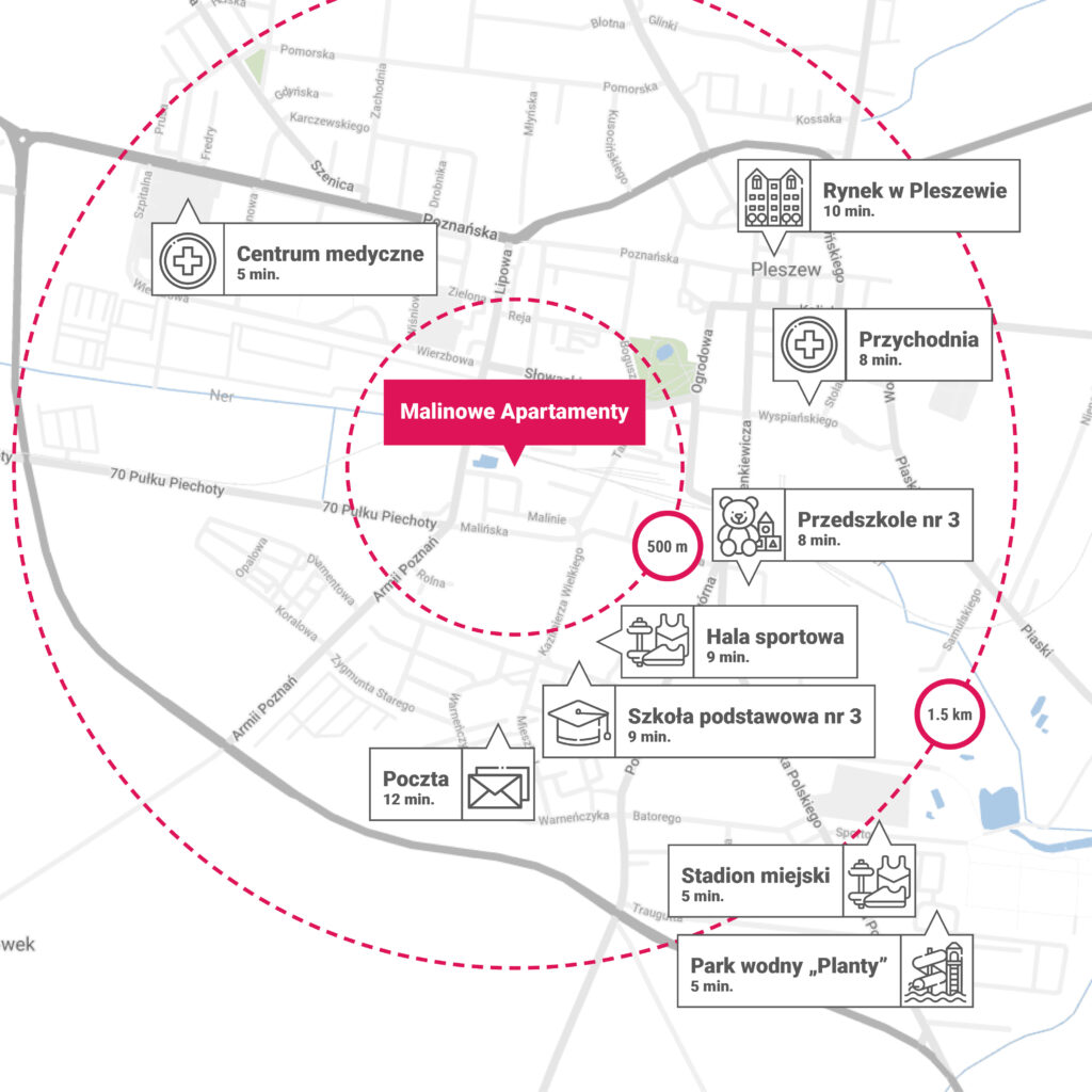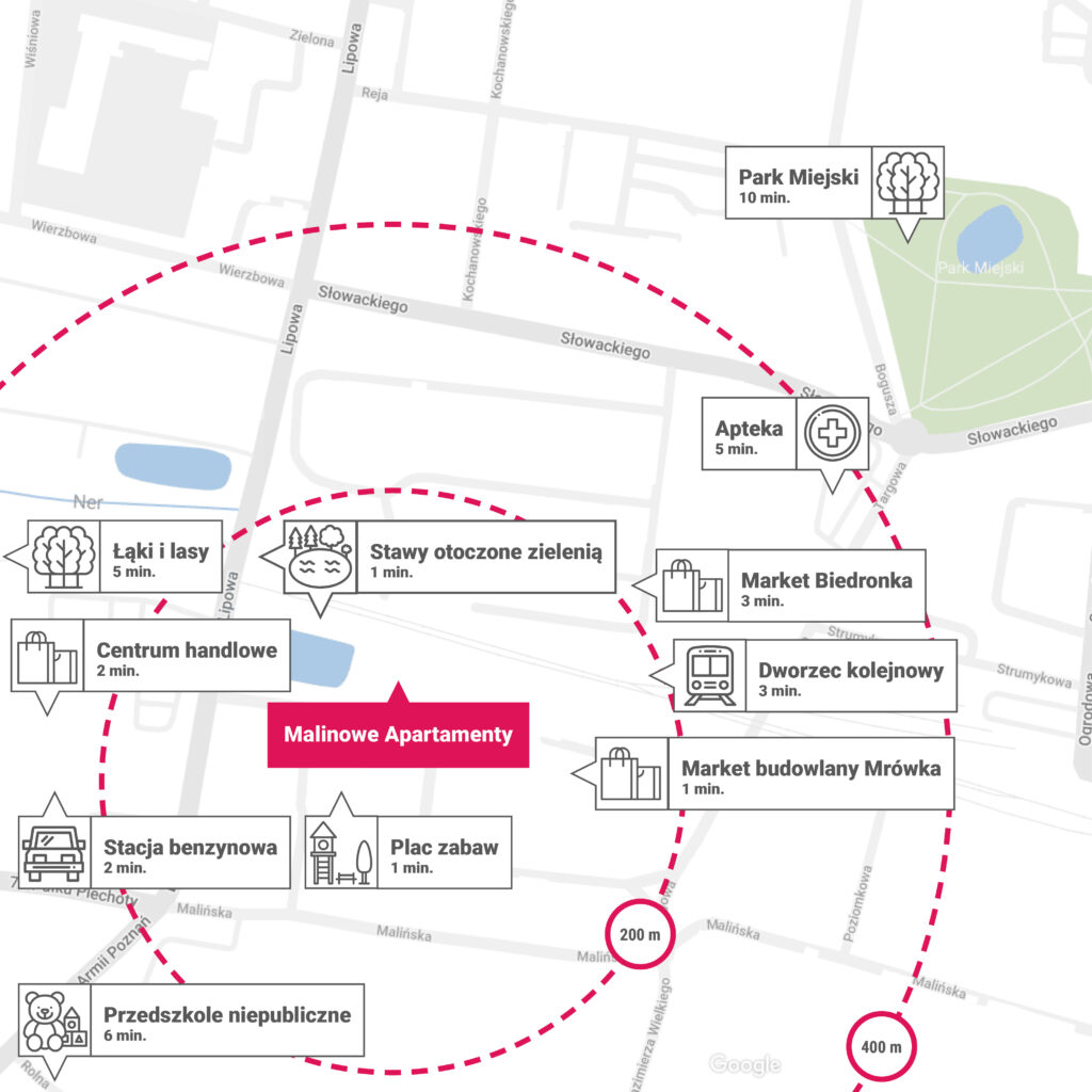 Inwestycja Malinowe Apartamenty to miejsce położone wśród terenów zielonych z jednoczesną bliskością infrastruktury miejskiej. Tuż za ogrodzeniem przebiega niedawno oddana ścieżka rowerowo-piesza, która znajduje się na rewitalizowanych terenach pokolejowych. To idealne miejsce na spacery czy wycieczki rowerowe w gronie rodzinnym.
